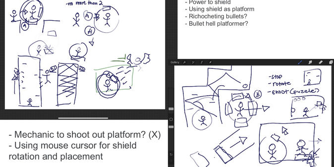 With the idea for a shield the player would control, our group explored a variety of different mechanics and genres until we reached our finalized concept.